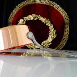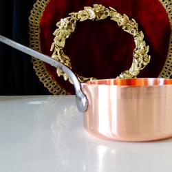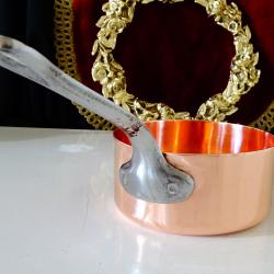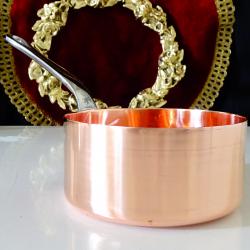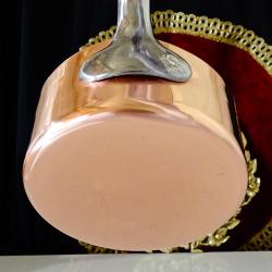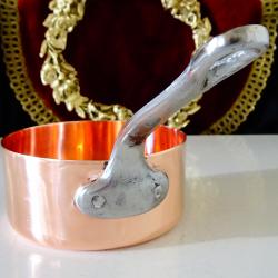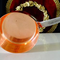 Стара медна тенджера, касерола, тиган за сосове, карамел, майсторска ръчна изработка от масивна чиста червена мед. Има яка чугунена дръжка закрепена с медни нитове. От вътре не е калайдисана, подходяща за медна вода. Тенжерата не е ползвана, блести ослепително от вън и от вътре. Елитен съд за готвене, сервиране и декорация. Височина 5 см., диаметър 10.5 см., дължина на дръжката 12 см., тегло 200 гр. Вместимост 450 мл. Тенджерата е част от комплект, който може да разгледате в моите обяви.