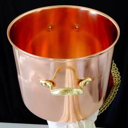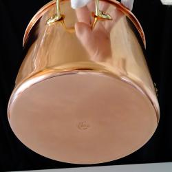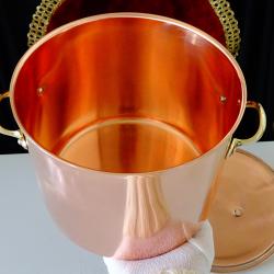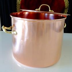 Стара медна тенджера, майсторска ръчна изработка от масивна, високо качествена чиста червена мед. Маркирана с печат на производителя Copral Made in Portugal. Вечен съд за готвене и сервиране, кован от цялостен меден лист без снадки и спойки. Има масивни дръжки отляти от високо качествен златен бронз, стабилно захванати за съда с дебели медни нитове. От вътре не е калайдисана, подходяща за медна вода. Тенджерата блести като нова от вън и от вътре, идеална за ползване, декорация и подарък. Височина 17 см., диаметър 20 см., дължина с дръжките 24 см., тегло 800 гр. Вместимост 4.5 литра.