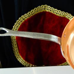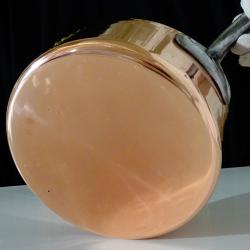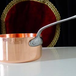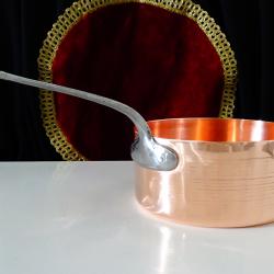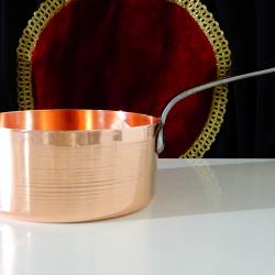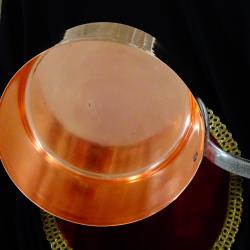 Стара медна тенджера, медна касерола, меден тиган, майсторска ръчна изработка от масивна чиста червена мед. Има яка чугунена дръжка стабилно закрепена за съда с дебели нитове. От вътре не е калайдисана, подходяща за медна вода. Тенжерата не е ползвана, блести ослепително от вън и от вътре. Елитен съд за готвене, сервиране и декорация. Височина 8.5 см., диаметър 19 см., дължина на дръжката 19 см., тегло 570 гр. Вместимост 3 литра. Тенджерата е част от комплект, който може да разгледате в моите обяви.