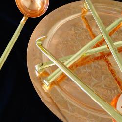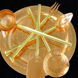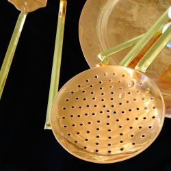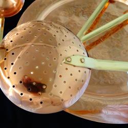 Старинни немски прибори за готвене и сервиране, майсторска ръчна изработка от масивна високо качествена червена мед. Дръжките са изработени от масивен як месинг със златен блясък, стабилно занитени с медни нитове и удобна кука за окачване. Безупречно качество и външен вид. Налични: - Черпак - дължина 37 см., височина на съда 5 см., диаметър 10 см., вместимост 200 мл. Тегло 230 гр. Цена 49 лв. - Черпак за пяна, РЕШЕТЪЧНА ЛЪЖИЦА, ЦЕДКА – дължина 38 см., диаметър 11.5 см., тегло 190 гр. Цена 49 лв. ДРУГИТЕ ПРИБОРИ СА ПРОДАДЕНИ.