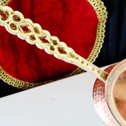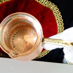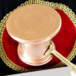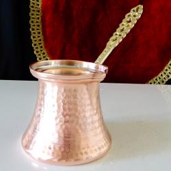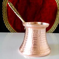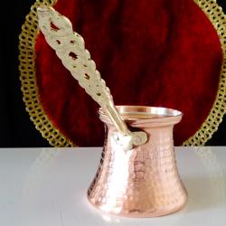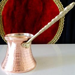 Старо медно джезве, ръчно ковано от масивна чиста червена мед. Има бронзова дръжка, стабилно закрепена за съда с медни нитове. Височина 8 см., диаметър на дъното 9 см., дължина на дръжката 13.5 см., тегло 160 гр. Вместимост 250 мл.