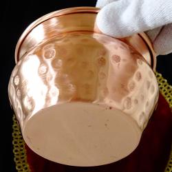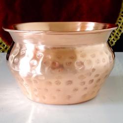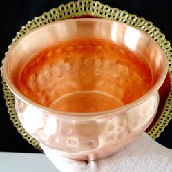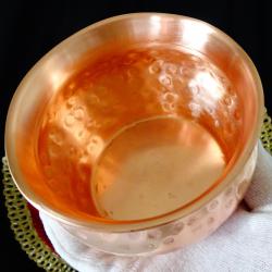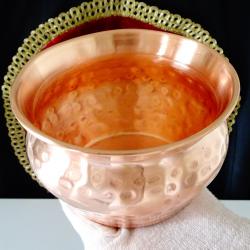 Старинен меден съд, медно котле, менче, медна чаша за вино, майсторска ръчна изработка от чиста червена мед. Високо качествен съд, безшевно кован с красив релеф. От вътре не е калайдисан, перфектен за медна вода. Височина 7 см., диаметър 11.5 см., тегло 190 гр. Вместимост 500 мл.