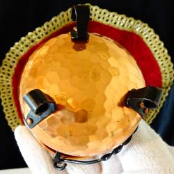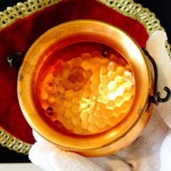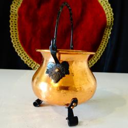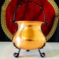 Старо медно менче, майсторска ръчна изработка от чиста мед. Декорирано с красив кован релеф пчелна пита, стои стабилно на три елегантни крачета. Има извита дръжка от пресукано ковано желязо, декорирана с лозов лист. Височина с дръжката 12 см., височина без дръжката 7 см., диаметър 8.5 см., тегло 80 гр. Вместимост 150 мл.