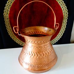 Старо медно менче, медно котле за вино, ръчно ковано от високо качествена чиста мед. Декорирано с красиви релефно ковани битови орнаменти. Дръжката е изработена от масивна мед, стабилно закрепена за съда с яки медни нитове. От вътре не е калайдисано, подходящо за медна вода. Има маркировка на майстора. Котлето не е ползвано, идеално за употреба, декорация и подарък. Височина с дръжката 25 см., височина на съда 14 см., диаметър на дъното 16 см. Тегло 440 гр. Вместимост 2 литра.