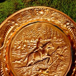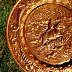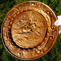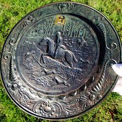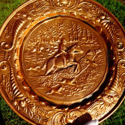 Стара английска медна чиния за стена, пано ръчно кована от чиста мед с релефна ловна картина - ловци, ездачи, конe, кучета, изобразяваща Лов на лисици. Периферията е декорирана с релефни барокови орнаменти и рог на изобилието. Има окачалка за стена с маркировка на производителя Made in England. Диаметър 36 см., височина 2.5 см., тегло 320 гр.