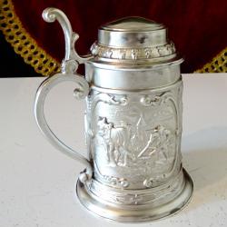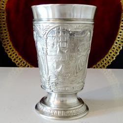 Старинна тенджера, майсторска ръчна изработка от високо качествен златен месинг, кована с разкошен релеф в стил Art Nouveau. Капака приляга плътно, безупречно качествен съд. Вълшебно красива тенджера, маркирана Wümak Germany. Произведена е от немската фабрика Würtemburgische Metallmanufaktur Adolf Knecht GmbH, създадена през 1899 г., в Щутгарт. Въпреки 120 годишната си история, този съд достойно ще краси всеки дом и всяка трапеза. Височина с капака 34 см., височина на съда 21 см., диаметър 28 см., тегло 1.3 кг. Имам и много красиви чаши на Wümak със същия релеф, които може да разгледате в моите обяви.