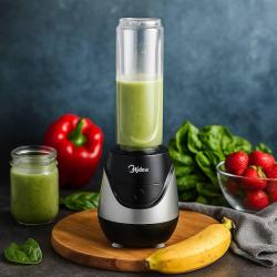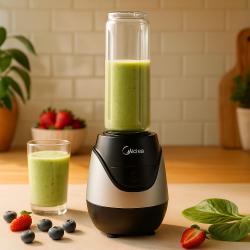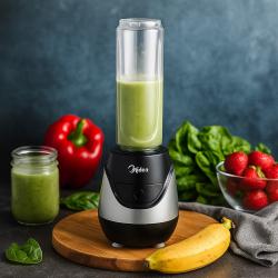 Продава се компактен и мощен персонален блендер Midea, идеален за забързаното ежедневие. Само с едно натискане приготвяш смути, фреш или протеинов шейк за секунди – директно в бутилката, която можеш да вземеш със себе си. С мощност от 600 W и 20 000 оборота в минута, блендерът смила без проблем плодове, зеленчуци, ядки и дори лед, осигурявайки гладка и приятна текстура. Компактният дизайн пести място, а почистването е бързо и лесно. Основни предимства: Мощност: 600 W 20 000 оборота в минута Бутилка To-Go 0.7 л (без BPA) 4 остриета за ефективно смилане Лесен за почистване (подходящ за съдомиялна) Защита от неправилно сглобяване Компактен и удобен за носене Подходящ за здравословни закуски, смутита и шейкове – у дома, в офиса или след тренировка. Отличен избор за хора, които искат бързо и лесно да се хранят здравословно. Гаранция: 12 месеца.