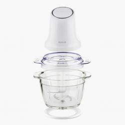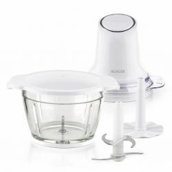 Продукт: Мини чопър Muhler MCH-5088 Основен проблем, който решава: Бавно и трудоемко рязане/приготвяне на продукти Решение: Мощно и равномерно смилане за секунди, без усилие Функции: Две скорости/Пулс режим/Разбиване, пасиране, смилане S-образен нож от неръждаема стомана Допълнителни ползи: Прахоустойчив капак/Заключваща система Стъклена купа – по-хигиенична и по-издръжлива Мощност: 500W Материал купа: Стъкло Капацитет: 1000 мл (работен обем 500 мл) Приставка: За разбиване и пасиране Цвят: Бяло / прозрачно Захранване: 220–240V Комплектът включва: Уред, стъклена купа, нож, капак, приставка