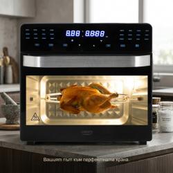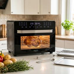 Технически характеристики на Многофункционален фритюрник с горещ въздух 30L - Мощна 2200W фурна с конвекция, 24 програми Ключови технически данни и спецификации на Camry CR 6323: Капацитет: 30 литра Мощност: максимум 2200 W (номинална 1700 W) Температурен диапазон: 80–230°C Таймер: до 90 минути Панел: сензорен с бял LED дисплей Врата: двуслойна стъклена Функции: 24 автоматични програми (пържене, печене, грил, дехидратиране и др.) Размери: 42.5 x 41.0 x 35.0 см Допълнително: вътрешно осветление, тип щепсел E/F, кабел 105 см