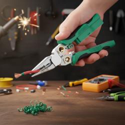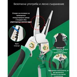 Материал: неръждаема стомана с ергономична гумена дръжка Размери: 20.7 см дължина x 8 см ширина Цвят: зелен с черни акценти Съвместимост: AWG 18, 14, 12, 10; 6/1.0; 1.5; 2.0; 2.5; 4.0 mm²; Cable Cape 25 mm²; окабеляване 2×1.5 mm² Функции: оголване, рязане (25 mm²), пресоване, кримпване, разклоняване, навиване, разделяне Тестер за напрежение: 12V–250V Допълнително: заключващ механизъм и пружинен отварящ механизъм за удобство