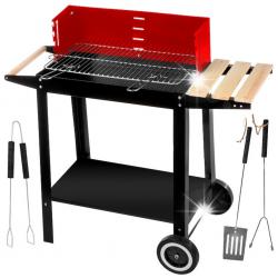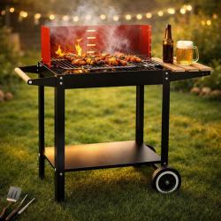 Практично градинско барбекю на колела от емайлирана стомана, създадено за любителите на домашните грил събирания. Осигурява контрол на температурата в 4 степени и включва подарък комплект от 3 прибора за незабавно начало. Характеристики: Тип продукт: Барбекю на въглища Тип гориво: Дървени въглища Материал: Емайлирана и боядисана стоманена ламарина Габаритни размери (Ш х В х Д): 86 см x 81 см x 40.5 см Работна височина: 65 см Горивна камера: Емайлирана за по-дълъг живот и лесно почистване Скара: Хромирана основна и скара за затопляне Регулиране: 4-степенно регулиране на височината на скарата Аксесоари: Хромиран шиш, дървена странична полица, долен рафт, дървена дръжка Мобилност: Две пластмасови колела за лесно преместване Комплект: Включва подарък 3 прибора за барбекю (шпатула, вилица и щипки) Предназначение: Семейни събирания, пикници, градинско готвене Доставка с Еконт с преглед. За повече продукти може да ни посетите на адрес: www. stokizavseki. com
