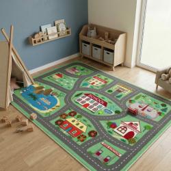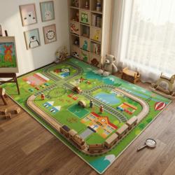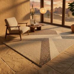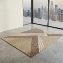 Технически характеристики на Модерен килим за хол 120х160см - Златисти триъгълници и райета и 3D ефект, Противоплъзгащ Техническите параметри осигуряват дълготрайна експлоатация и удобство при ежедневна употреба: Размер: 120 x 160 см — стандартен за зона пред диван или маса за кафе. Горен слой: мек синтетичен ворс с висококачествен 3D печат за наситени цветове. Основен слой: противоплъзгаща PVC/латекс подложка за стабилно закрепване върху различни настилки. Поддръжка: прахосмукачка, локално почистване с влажна кърпа; при силно замърсяване — професионално почистване. Съвместимост: подходящ за повечето системи за подово отопление (при високи температури се препоръчва консултация).