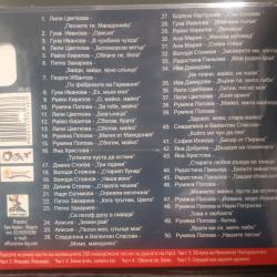 Издава: Ара аудио-видео Неразопакован MP3 диск. Съдържание: 01. Лили Цветкова - Песните ти, Македонийо 02. Гуна Иванова - Орисия 03. Гуна Иванова - В чужбина чужда 04. Лили Цветкова - Беломорски вятър 05. Райко Кирилов - Облаче ле, бяло 06. Петко Захариев - Зайди, зайди, ясно слънце 07. Георги Жбантов - По фабриките на Германия 08. Гуна Иванова - Ех, мъко моя 09. Райко Кирилов - О, майко моя 10. Румяна Попова - За тебе, майко 11. Лили Цветкова - Безсъници 12. Райко Кирилов - Сбогом, братя 13. Лили Цветкова - Сбогом, майко 14. Румяна Попова - Магия от Македония 15. Румяна Попова - Сбогом, майко 16. Яна Христова - Тугина пуста да остане 17. Джина Стоева - Три години 18. Володя Стоянов - Старият бунар 19. Володя Стоянов - Чаша вино 20. Джина Стоева - Старата чешма 21. Надя Евтимова - Огреяла месечина 22. Петко Захариев - Кога тръгнах, Цвето 23. Петко Захариев - Си легоф долу в ливада 24. Алисия - Земен рай 25. Алисия - Песен моя, слънце мое 26. Севдалина и Валентин Спасови - Моме, македонко 27. Боряна Карпузова - Сън сънувах 28. Гуна Иванова - Майчини сълзи 29. Райко Кирилов - Лихинда 30. Ана-Мария - Женска изповед 31. Ана Мария - Сойка птица 32. Володя Стоянов - Засвирете ми, чалгии 33. Радостина Паньова - Мой роден край 34. Ива Давидова - Не плачи, майко, не жали 35. Ива Давидова - Върни се, мило либе 36. Лили Цветкова - Литни, песно моя 37. Лили Цветкова - Коня враня 38. Румяна Попова - Майко, мила майчице 39. Румяна Попова - Здраво, живо, стара майко 40. Севдалина и Валентин Спасови - Който ме чуе да пея 41. София Илиева - Бисер от Пирина 42. Яна Добрева - Дъщеря на планината 43. Яна Христова - Старата любов ръжда не хваща 44. Радостина Паньова - Белите манастири 45. Радостина Паньова - Градил Илия килия 46. Румяна Попова - Меаните, майко, пусти да останат 47. Румяна Попова - Йоване, мори, Йоване 48. Румяна Попова и Наум Петрески - Това е любовта 49. Румяна Попова /китка/ - Врати ми се, мило либе 50. Румяна Попова - Нашите песни Цената е крайна. Доставка до офис на Спиди - 5 лв / Еконт - 7 лв Благодаря за проявения интерес!