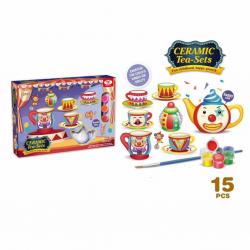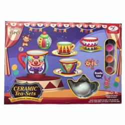 Този комплект е идеален за малки художници, които могат да оцветяват и декорират керамичен чаен сервиз. Включва 15 части и е подходящ за деца над 3 години. Характеристики Вид: Комплект за декориране и игра - детски Материал: Керамика Брой части: 15 Размер на опаковката: 20.5 х 5.5 х 29.5 см Подходящ за възраст: 3+ години