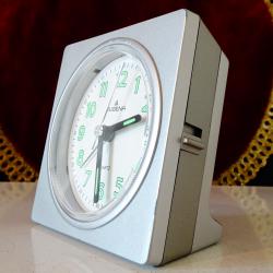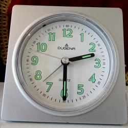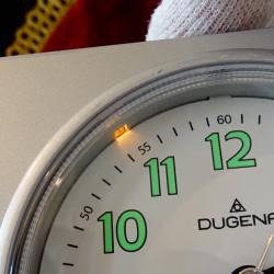 Немски настолен часовник с аларма, будилник на световно известната марка Dugena, чиито корени са в швейцарската асоциация на часовникарите Corporation dHorlogers Suisse, основана през 1883 г. Механизма на часовника е оригинален с плавно движение на секундната стрелка – абсолютно безшумен и свръх точен. Циферблата е със светещи стрелки и цифри, които светят през цялата нощ и се виждат перфектно. Допълнително има лампичка, която отлично осветява циферблата. Алармата има 4 степени, първата степен е приятна и не много силна, но последната ще събуди и Шрек. С две думи – будилник мечта. Височина 8.5 см., дължина 8.5 см., ширина 5 см., диаметър на циферблата 7 см.