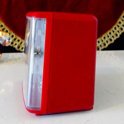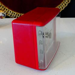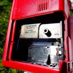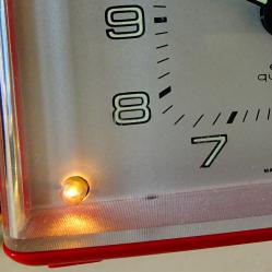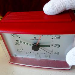 Немски настолен часовник с аларма, будилник Junghans, произведен през 1970 г. Механизма е оригинален, модел Euro Quartz със start-stop функция. Корпуса е с красив цвят бордо, циферблата е с отлично светещи цифри и стрелки. Има лампичка, която осветява циферблата – интересното е, че светва когато се повдигне часовника. Маркиран Made in Germany на три места. Алармата включва перфектно. Часовникът работи свръх точно с една стандартна батерия. Размер 9.5 х 7.5 х 5 см.