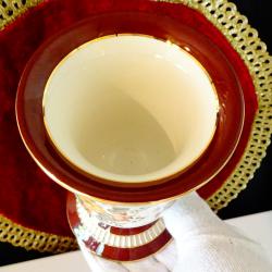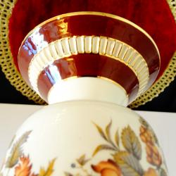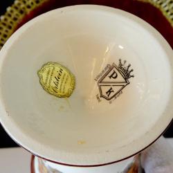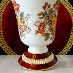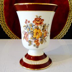 Старинна немска порцеланова ваза на фабриката PK Klaus Cutik, ръчно рисувана с красиви букети от пъстри цветя и блестящи кантове от 24 карата злато. Вазата стои елегантно на ефектно релефно столче. Датира от 1950 година. Височина 13 см., диаметър 9 см. Имам и свещник от същия производител, който може да разгледате в моите обяви.