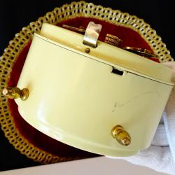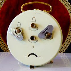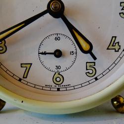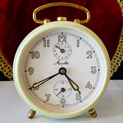 Стар немски настолен часовник, будилник Mauthe. Часовника работи перфектно и точно. Звъни приятно. Корпуса е метален, механизма е оригинален бронзов, цифрите и стрелките са светещи. Стои стабилно на бронзови крачета Височина 13 см., диаметър 10 см, ширина см., тегло 385 гр.