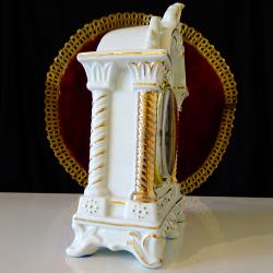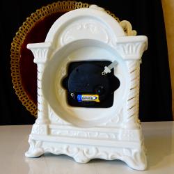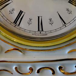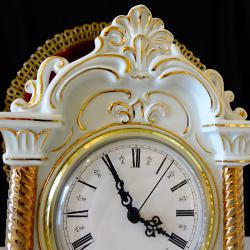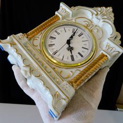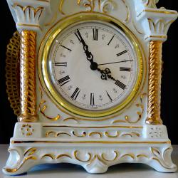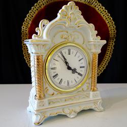Стар немски настолен часовник с кварцов механизъм маркиран от производителя – работи перфектно и точно, тик-така свръх дискретно. Циферблата е с гривна от позлатен месинг, безупречно стъкло, красиво изписани римски цифри и релефни барокови стрелки със секундарник. Корпуса на часовника е изработен от релефно декориран снежно бял порцелан, подчертан с много ръчно рисувано злато 24 карата. Красивите релефни орнаменти и златни колони са издържани в стил Art Nouveau. Височина 20 см., дължина 14 см., ширина 6.5 см. Диаметър на циферблата 9 см.