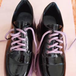 Обувките - състоянието е много добро, без забележи. Хигиенично чисти са. Цена 12 евро. Има лачена черна чанта към тези обувки подходяща, изкуствена кожа, състоянието е здраво, без заюележи. Цена 10 евро. Обувки + чанта, цена 20 евро. Доставка Спиди или лично.