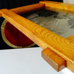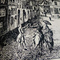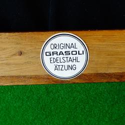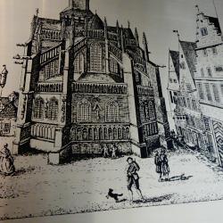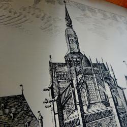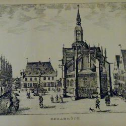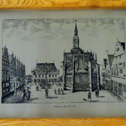 Стара литография с прецизно гравирано изображение от град Оснабрюк с ембематични сгради в готически стил, върху високо качествена стомана солинген. Литографията е на световно известния немски художник Grasoli с множество самостоятелни изложби, който от 1950 година основава собствена компания в град Solingen, която произвежда дизайнерски изделия от прочутата стомана. Има масивна рамка от парен немски дъб с красиви шарки и запазен етикет. Размери 45 х 36 см.