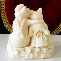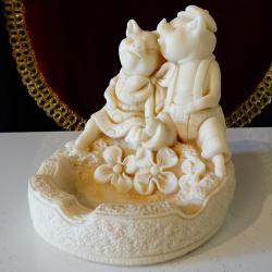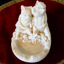 Стар пепелник, майсторска ръчна изработка от стеатит – сапунен камък, маркиран с инициалите на световно известната италианска марка FARO. Декориран с фигура на две чаровни влюбени прасенца сред красиви цветя. Размер 12 х 11 х 12 см. Тегло 609 гр.