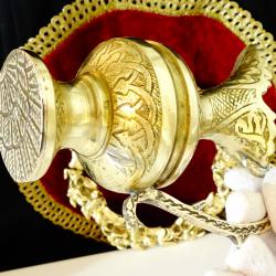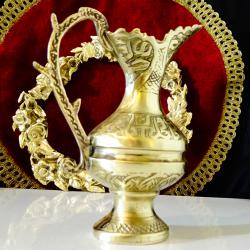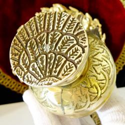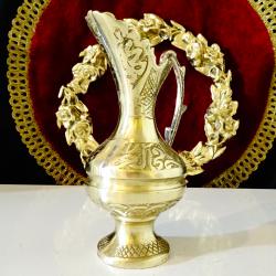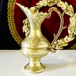 Старинна персийска кана за ракия, майсторска ръчна изработка от свръх масивен бронз. Ефектно декорирана с богати релефни орнаменти и арабска калиграфия, тугри. Основата на каната дори е релефно гравирана с орнаменти, които ми приличат на разперена опашка на паун, за да не се плъзга. Истинско произведение на изкуството със златен блясък. Височина 14 см., дължина 11 см., диаметър 7 см. Тегло 320 гр. Вместимост 200 мл.