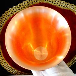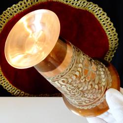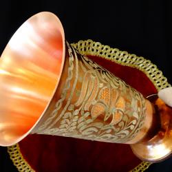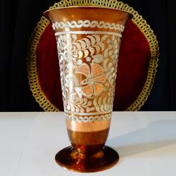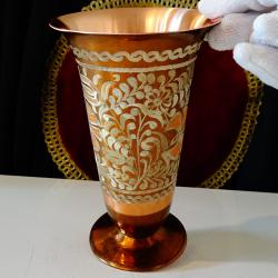 Старинен меден бокал за вино, чаша на столче, ваза, салфетник, майсторска ръчна изробтка от чиста червена мед. Декориран с ръчно релефно писани цветя и орнаменти. От вътре не е калайдисан, блести с ослепителен огнен блясък, подходящ и за медна вода. Височина 17 см., диаметър 10.5 см., тегло 170 гр. Вместимост 500 мл.