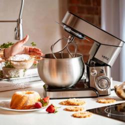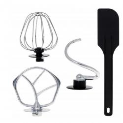 Корпус от неръждаема стомана. Система от пластмасови зъбни колела. 5 л купа от неръждаема стомана с прозрачен капак против пръски. Откачаща се алуминиева бъркалка за тесто, за яйца и сметана, алуминиева плоска бъркалка и шпатула. 6 степени на скорост + пулс функция + LED лампичка. 4 крачета против хлъзгане. Наклоняваща се глава, която позволява лесно сваляне на купата. Система за планетарно движение. Захранване: 220-240V, 50-60Hz, 1000W.