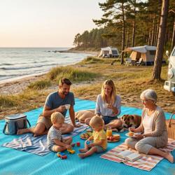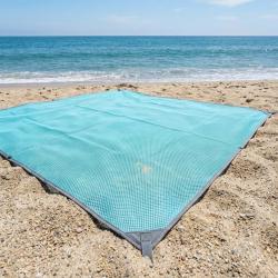 Технически характеристики на Плажна постелка без пясък XXL – двуслойна мрежа, водоустойчива, лека и компактна за плаж, къмпинг и пикник Пълните данни, които да ви убедят веднага: Размери: 200 x 200 см (XXL) Тегло: приблизително 400 g Материал: двуслойна мрежеста технология със заздравени ръбове Цвят: син Фиксация: 4 метални О-пръстена в ъглите (колчета не са включени) Предназначение: плаж, къмпинг, пикник, градина Почистване: бързо изтриване, изплакване или машинно пране при необходимост