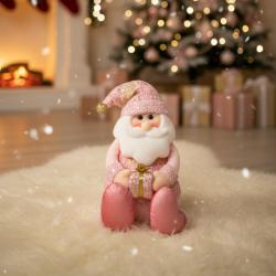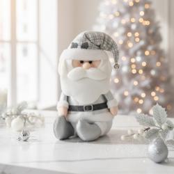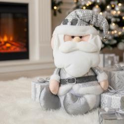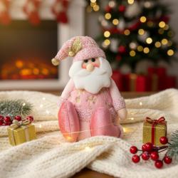 Тип: Седяща коледна фигура „Дядо Коледа“; Материали: плюш, текстилни тъкани, синтетичен пълнеж; Цветови варианти: Сив / Розов; Приблизителни размери: Сив -20см/ Розов - 18см Предназначение: интериорна декорация за дома, офиса, магазини и фотокът; Поддръжка: почистване с мека суха кърпа; съхранение в оригиналния плик на сухо място.