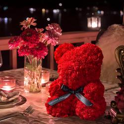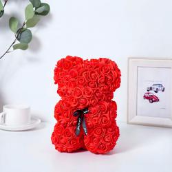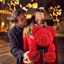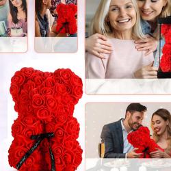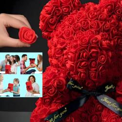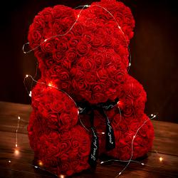 Изработен от стотици нежни PE рози, изглежда като произведение на изкуството. Привличащо вниманието LED осветление – фините светлини добавят блясък и романтика. Готови за подаряване – опаковани в елегантна, прозрачна кутия с панделка, за самостоятелно сглобяване.. Розите не избледняват и запазват цвета си дълго време. Интериорна декорация – украсява вашата спалня, хол или бюро, добавяйки романтична атмосфера. Перфектният подарък за приятелка, съпруга, майка, баба или приятелка – за Свети Валентин, Ден на жената, рожден ден, годишнина или празник. Размери на опаковката в разгънато състояние: 30 x 20 x 20 см. Размери на плюшеното мече: 25 x 15 см. Цвят: нюанси на червено и черно. Материал: пяна, PE Комплектът включва плюшено мече и кутия (кутия за самостоятелно сглобяване).