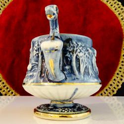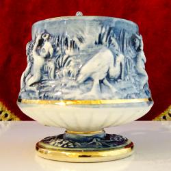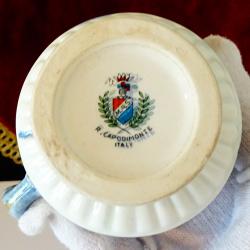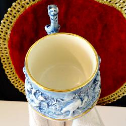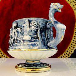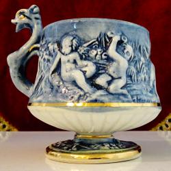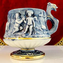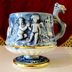 Италианска порцеланова чаша за кафе, чай, Capodimonte, маркирана. Релефно декорирана с ангели, които безгрижно се забавляват, щъркел и 24 карата злато. Дръжката на чашата е като скулптура на морска змиорка. Ефектен дизайн в стил Ампир с красиво релефно столче. Височина 9 см., диаметър 7.5 см., вместимост 160 мл.