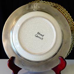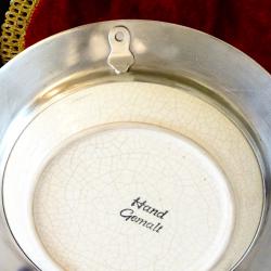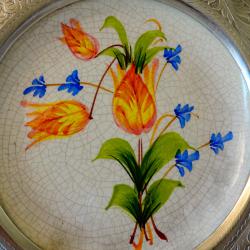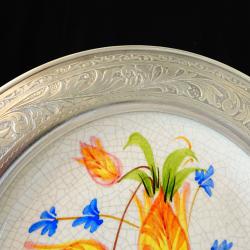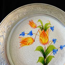 Стара декоративна чиния за стена, фруктиера, майсторска ръчна изработка от порцелан и калай. Централната част е от порцелан с напукан ефект, ръчно рисуван с пъстър букет от лалета и синчец. Периферията е изработена от 95% калай и 5% сребро, декорирана с прецизно изваяни и приказно красиви релефни флорални орнаменти. Диаметър 25.5 см., височина 2.5 см., тегло 700 гр.