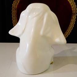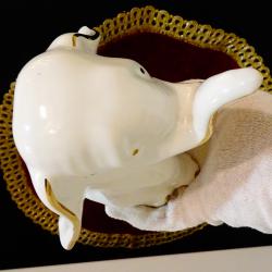 Западно германска фигура Слон от фин снежно бял порцелан, ръчно рисувана с 24 карата злато. Изключителна колекционерска находка, произведена през 70-те години на миналия век на тъжно слонче, свило ушите някак притеснено. Височина 14 см., дължина 15 см., ширина 14 см. Перфектна.