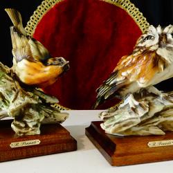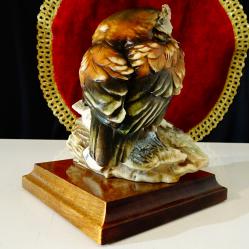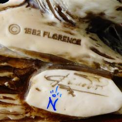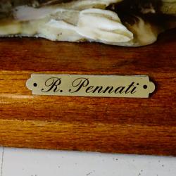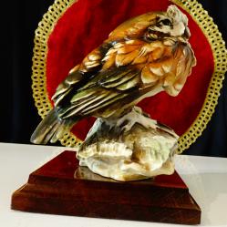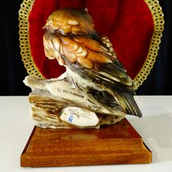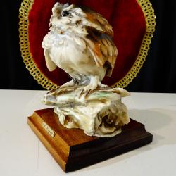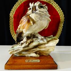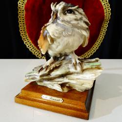 Стара порцеланова статуетка Capodimonte, фигура на птица Бухал или Сова, ръчно изработена от италианския скулптор и дизайнер R. Pennati през 1982 година във Флоренция. Маркирана с печат, релефен подпис и надпис върху позлатена бронзова табелка. Има масивна основа от плътно естествено дърво. Височина 15 см., диагонал на основата 16 см., тегло 930 гр. Перфектна.