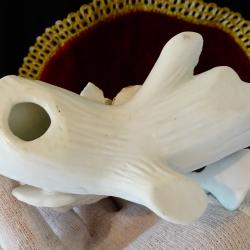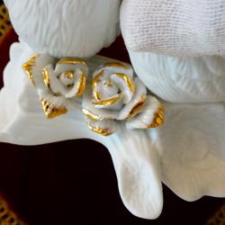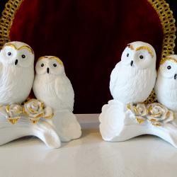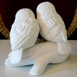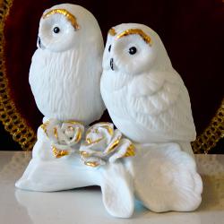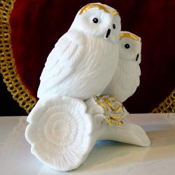 Стара порцеланова статуетка, фигура на двойка бели Сови, кацнали върху ствол на дърво и красиви рози. Декорирана с блестящо злато. Много прецизна ръчна изработка от снежно бял костен порцелан. Размер 11 х 11.5 х 7 см. Перфектна. Налични 2 броя, цена 35 лв., за брой.