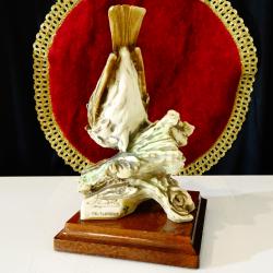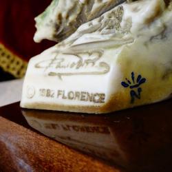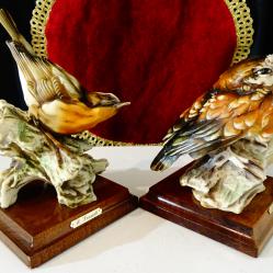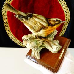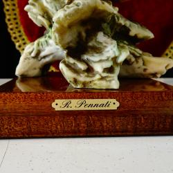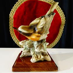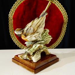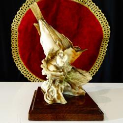 Стара порцеланова статуетка Capodimonte, фигура на птица Червеногръд Дрозд, ръчно изработена от италианския скулптор и дизайнер R. Pennati през 1982 година във Флоренция. Маркирана с печат, релефен подпис и надпис върху позлатена бронзова табелка. Има масивна основа от плътно естествено дърво. Височина 19 см., диагонал на основата 16 см., тегло 800 гр. Перфектна. Имам още една статуетка на Бухал или Сова, която може да разгледате в моите обяви.