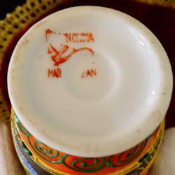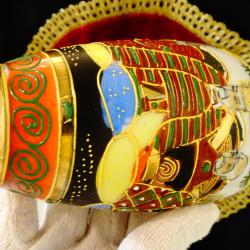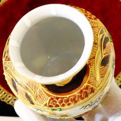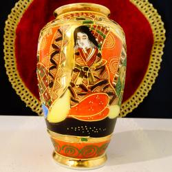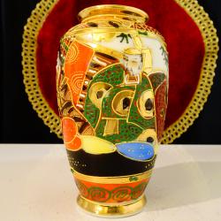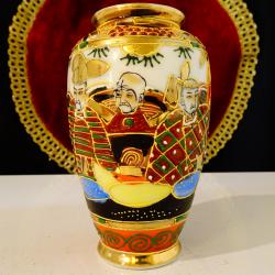 Стара японска порцеланова ваза, костен порцелан, ръчно рисувана в стил Сатцума с блестящо злато 24 карата и изпъкнали цветни емайли Moriage. Маркирана с драконов печат. С изключително качество и прецизност са изобразени Богинята на милосърдието Канон, заобиколена от легендарните ученици на Буда, наречени Rakan. Височина 13 см., диаметър 8 см.