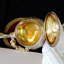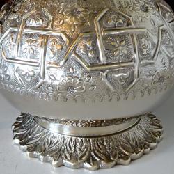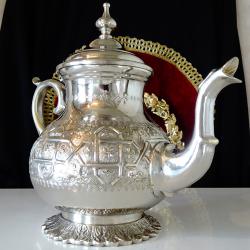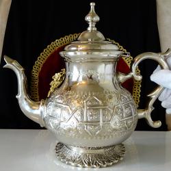Стар чайник, кана, майсторска ръчна изработка от високо качествен масивен бронз, дебело посребрен с висока проба сребро. Маркиран Fabrique Touzani Mohamed Barouk Fes. Декориран с красиви релефно ковани орнаменти, чайника стои елегантно повдигнат на масивна стабилна основа с разкошни орнаменти. Вечен чайник, истинско произведение на мароканското традиционно изкуство, свързано с прочутата чаена церемония, символ на гостоприемството в Мароко. Не е ползван, блести като нов от вън и от вътре, идеален за ползване, декорация и подарък. Височина 24 см., диаметър 16 см., дължина 27 см. Тегло 1.1 кг. Вместимост 3 литра.
