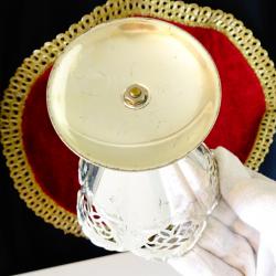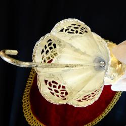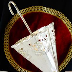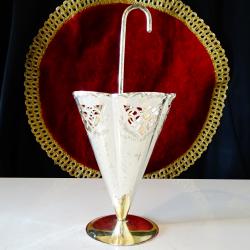 Стара поставка за салфетки, салфетник, държач за салфетки, изработен от високо качествен як месинг, дебело посребрен с висока проба сребро, родиран за блясък и трайност. Има ефектен дизайн на чадър, чадърче, декориран по периферията с красив ажур и релефни орнаменти в стил Art Nouveau. Височина 19 см., диаметър 9.5 см., тегло 100 гр.