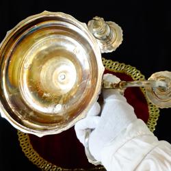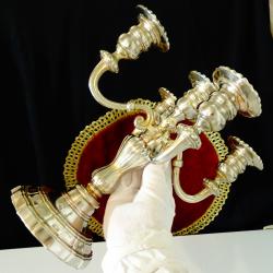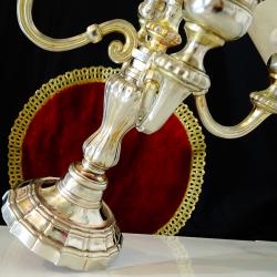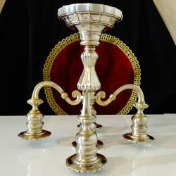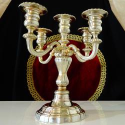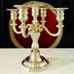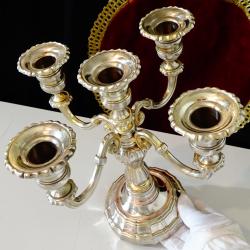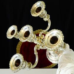 Стар свещник петица, свещник за пет броя свещи, петорен свещник, канделабра, майсторска ръчна изработка от масивна мед, дебело посребрен с висока проба сребро, родиран за блясък и трайност. Изключително ефектен релефен дизайн, издържан в стил кралица Виктория, викториански стил. Височина 25 см., диагонал 25 см., диаметър на основата 12 см., тегло 1640 гр.