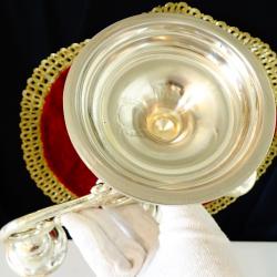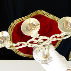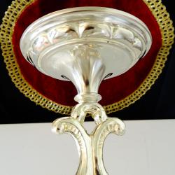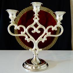 Стар троен свещник, свещник тройка, свещник с три гнезда, изработен от високо качествена масивна мед, дебело посребрен с висока проба сребро, родиран за блясък и трайност. Има ефектен релефен дизайн в стил Art Nouveau с орнаменти, които оформят красиво сърце. Височина 23 см., дължина 22 см., диаметър на основата 10 см. Тегло 630 гр.