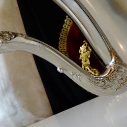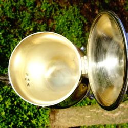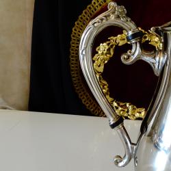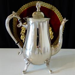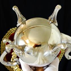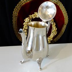 Стара немска кана за чай, кафе, вино, майсторска ръчна изработка от високо качествен масивен бронз, дебело посребрена с висока проба сребро, родирана за блясък и трайност. От вътре има перфектно и отлично запазено сребърно покритие, идеална за сребърна вода със сребърни йони. Красиво декорирана с прецизно изваяни релефни цветя и орнаменти в стил Art Nouveau. Стои стабилно на четири елегантни релефни крачета. Капака се затваря плътно. Безупречна кана, идеална за ползване, декорация и подарък. Височина 24 см., дължина 23 см., диаметър 12 см., тегло 1 кг. Вместимост 1.2 л. Каната е част от сервиз с поднос, захарница и каничка, които може да разгледате в моите обяви.