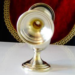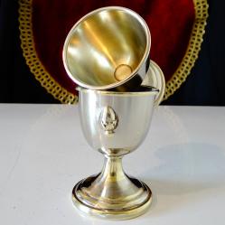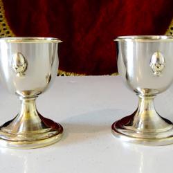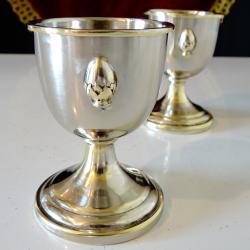 Стари английски чаши за ракия, ликьор, чаши за яйце, коктиера, майсторска ръчна изработка от високо качествен як бронз. Красиво декорирани с релефно изображение на лешник или на яйце в чашка. Височина 6.5 см., диаметър 4.8 см., тегло на всяка 50 гр. Вместимост 50 мл. Налични 2 броя, цена 7.99 €., за брой.