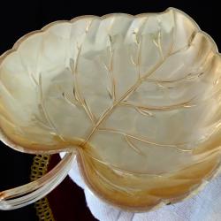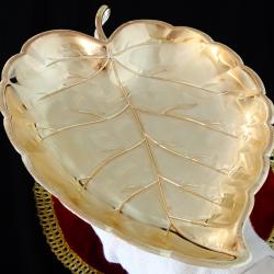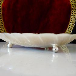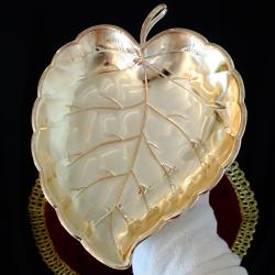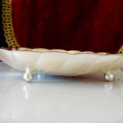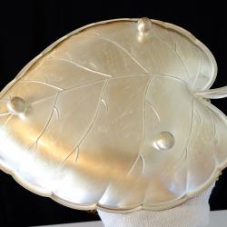 Стара фруктиера, бонбониера, купа, съд за сервиране, майсторска ръчна изработка от як бронз, дебело посребрена с висока проба сребро, родирана за блясък и трайност. Има ефектен дизайн и релеф на листо, стои стабилно на три крачета топчета. Този модел е петантован от Западно Германската фабрика Quist, която в момента е част от WMF. Съда не е маркиран, защото се е продавал с етикет. Дължина 22.5 см., ширина 17 см., височина 3.5 см. Тегло 180 гр. Перфектна.