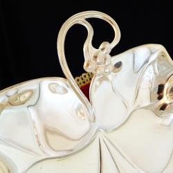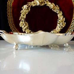 Стара фруктиера, купа, съд за сервиране, изработена от масивен бронз, дебело посребрена с висока проба сребро, родирана за блясък и трайност. Маркирана с инициалите на световно известната немска фабрика WMF. Изключително красив съд с ефектен дизайн на Лозов лист с извита дръжка и зряло грозде, издържана в стил Art Nouveau. Дължина 24 см., ширина 20 см., височина 5 см. Тегло 270 гр.