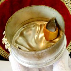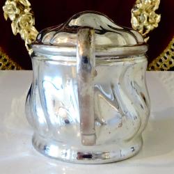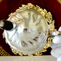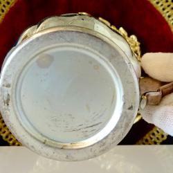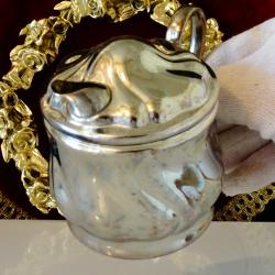 Стара кана за мляко, каничка, захарница, изработена от високо качествен бронз, дебело посребрена с висока проба сребро. Декорирана с ефектен релеф в стил Art Nouweau. Височина 8.5 см., диаметър 8.5 см., тегло 180 гр. Вместимост 160 мл.
