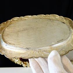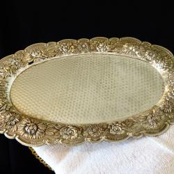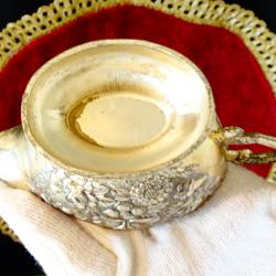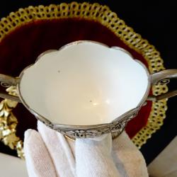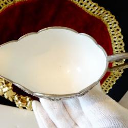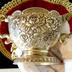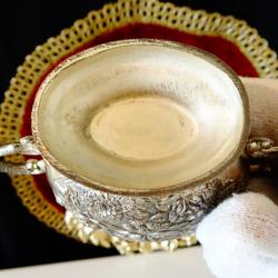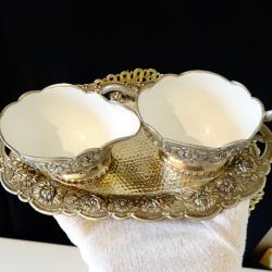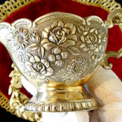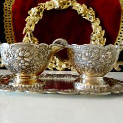 Стар посребрен комплект за кафе и чай - каничка за мляко, захарница и поднос, изработени от масивна мед, дебело посребрени с висока проба сребро. От вътре имат снежно бял порцеланов емайл. Декорирани с прецизно изваяни релефни рози, цветя и барокови орнаменти. - каничка и захарница – височина 7 см., дължина 12 см., ширина 5.5 см., тегло на захарницата 180 гр., тегло на каничката 115 гр. Вместимост по 100 мл. - поднос – дължина 21 см., ширина 12 см., височина 1 см., тегло 125 гр.