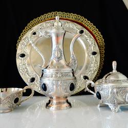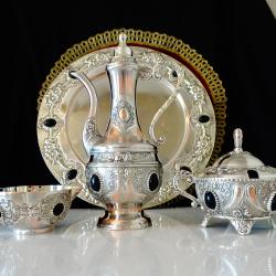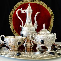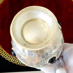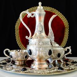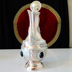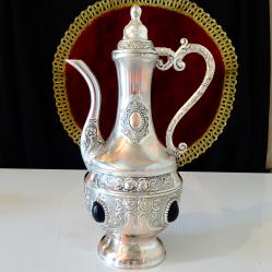 Кана за кафе, вино, ликьор, чай, изработена от масивна мед, дебело посребрена с висока проба сребро, родирана за блясък и трайност. Декорирана с релефни рози, орнаменти и черен оникс. От вътре е като нова, идеална за ползване – не успях да я покажа на снимки, заради тънката гърловина. Височина 23 см., дължина 14 см., диаметър 10 см, тегло 470 гр. Вместимост 600 мл. Каната е част от сервиз, който може да разгледате подробно в моите обяви.